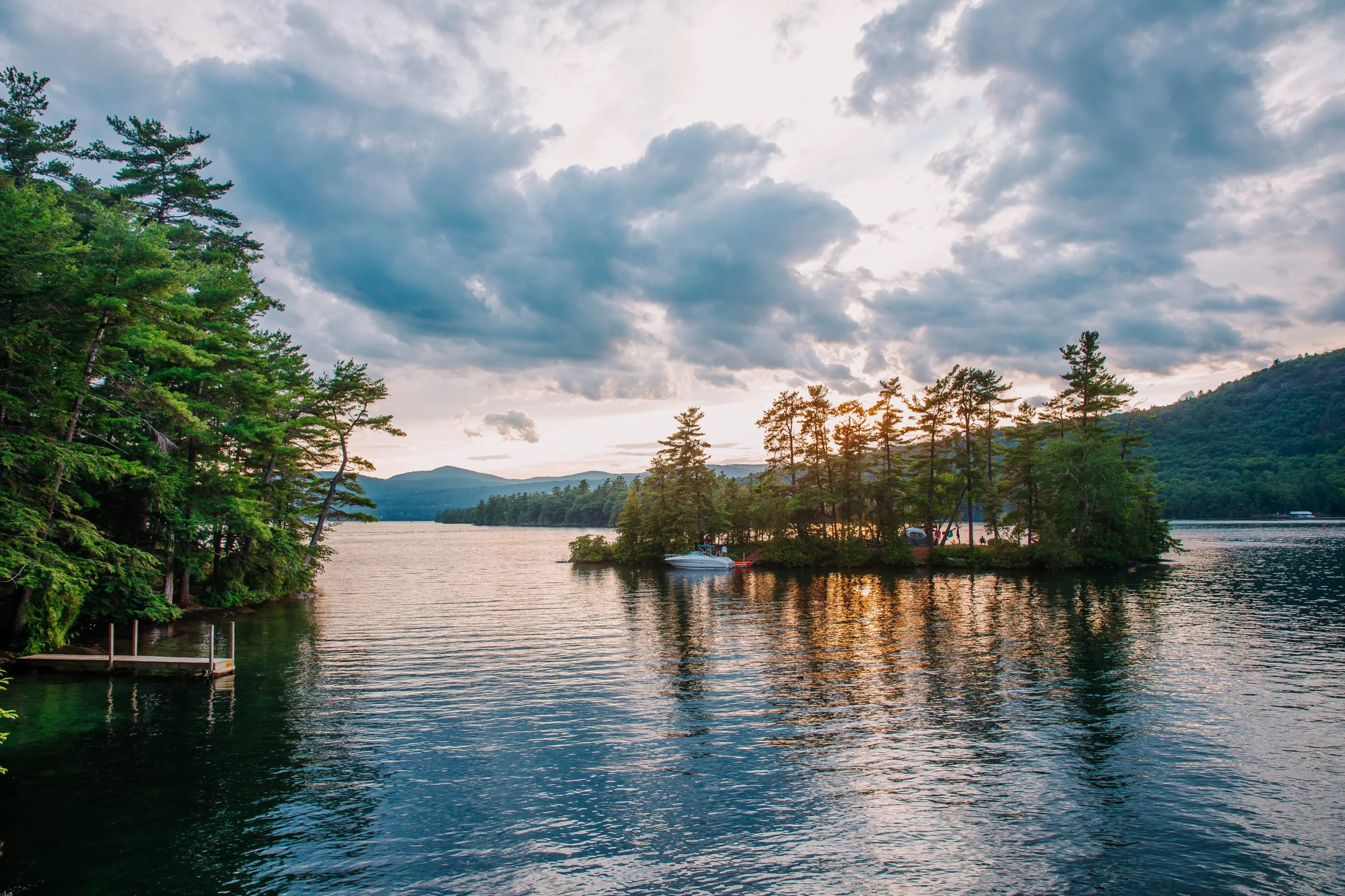 Modern kitchen with marble countertops, stainless steel appliances, white cabinetry, a large kitchen island, hanging pendant lights, indoor plants, and a scenic outdoor view through large windows.